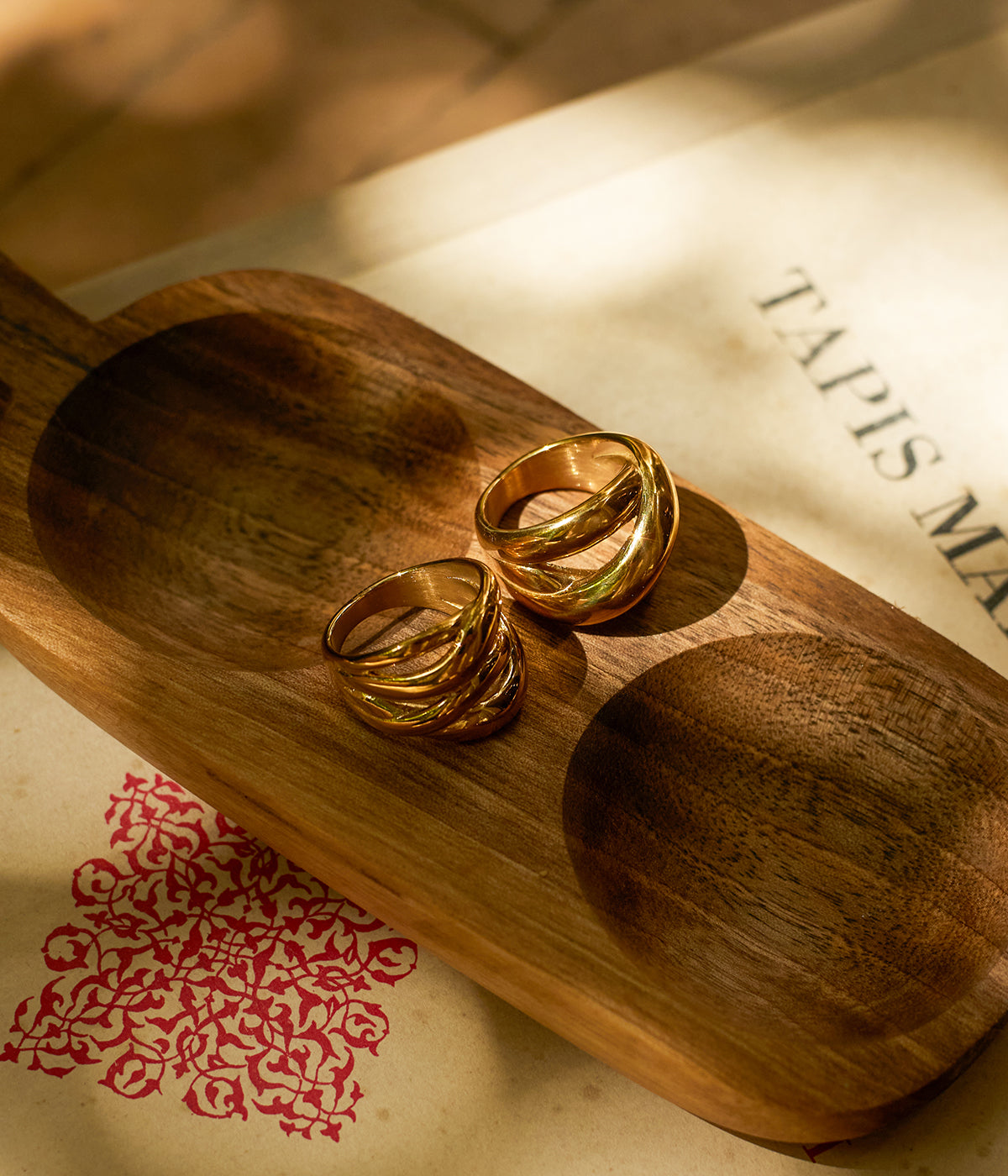 Bague en acier uni ou doré à l’or fin. Cette bague est composée de plusieurs formes arrondies superposés les uns au dessus des autres.