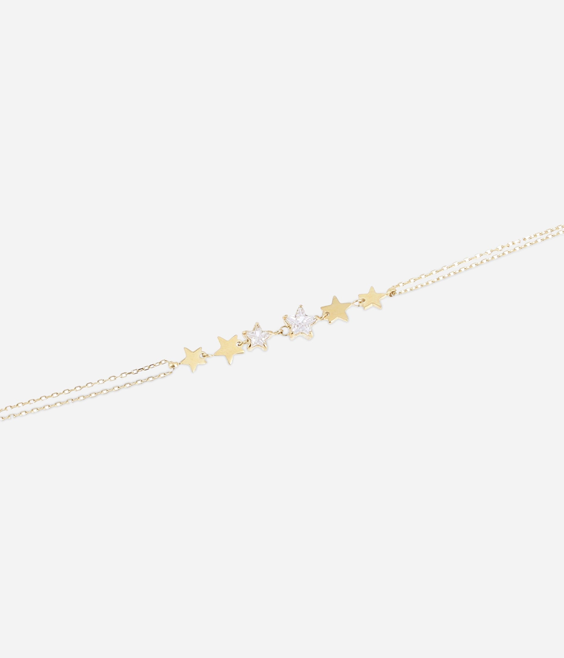 Bracelet en acier uni ou doré à l'or fin par ionisation composé de plusieurs étoiles reliées les unes au dessus des autres grâce à des petits maillons. 2 étoiles sont en zirconium.