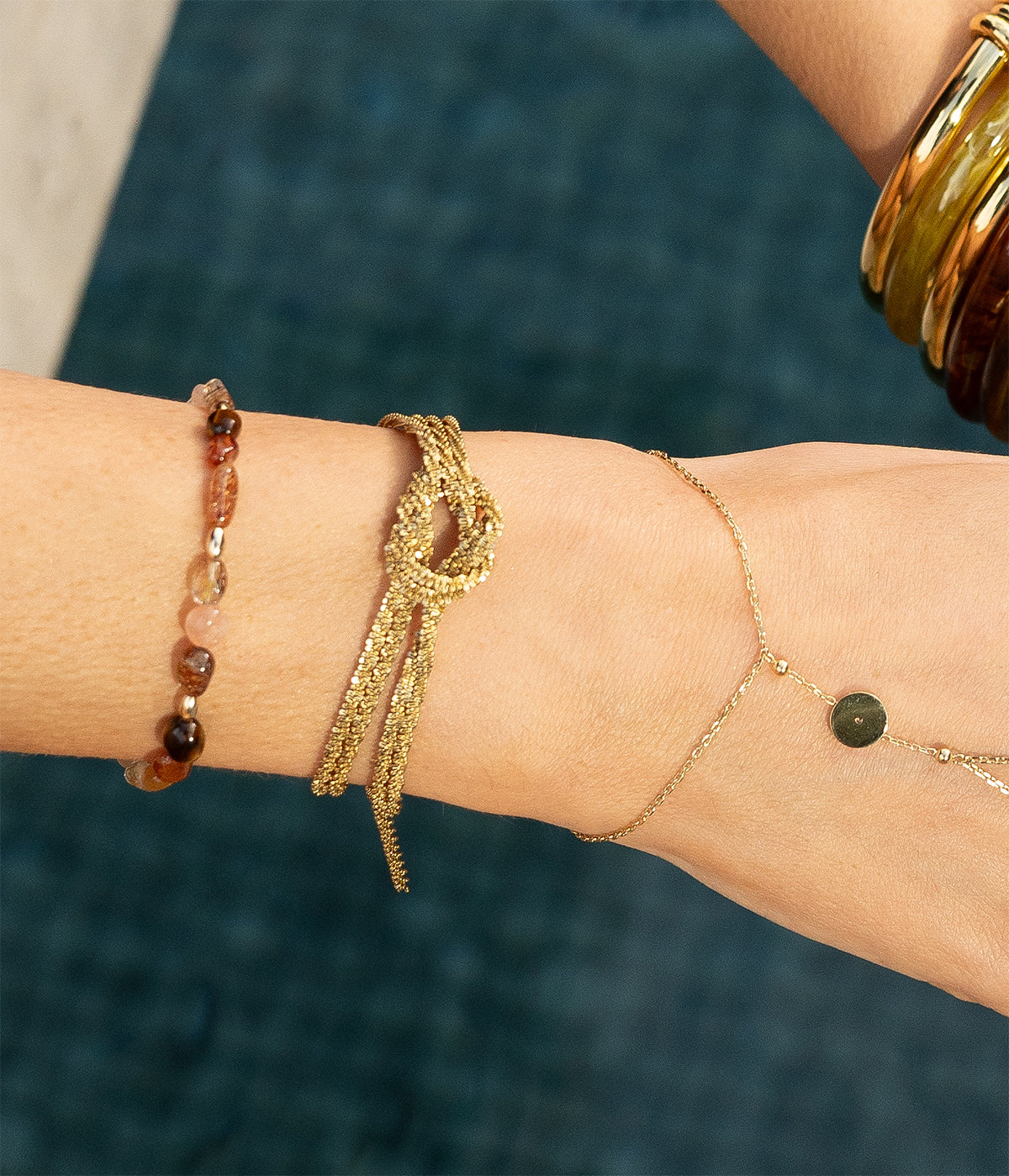 Bracelet en acier uni ou doré à l'or fin par ionisation composé de 4 chainettes croisées qui forment un nœud sur le dessus.