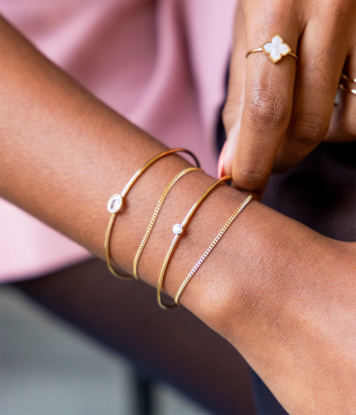 Il s'installe sur le poignet à plat comme une seconde peau et se mélange à ravir avec d'autres bracelets de nos collections.