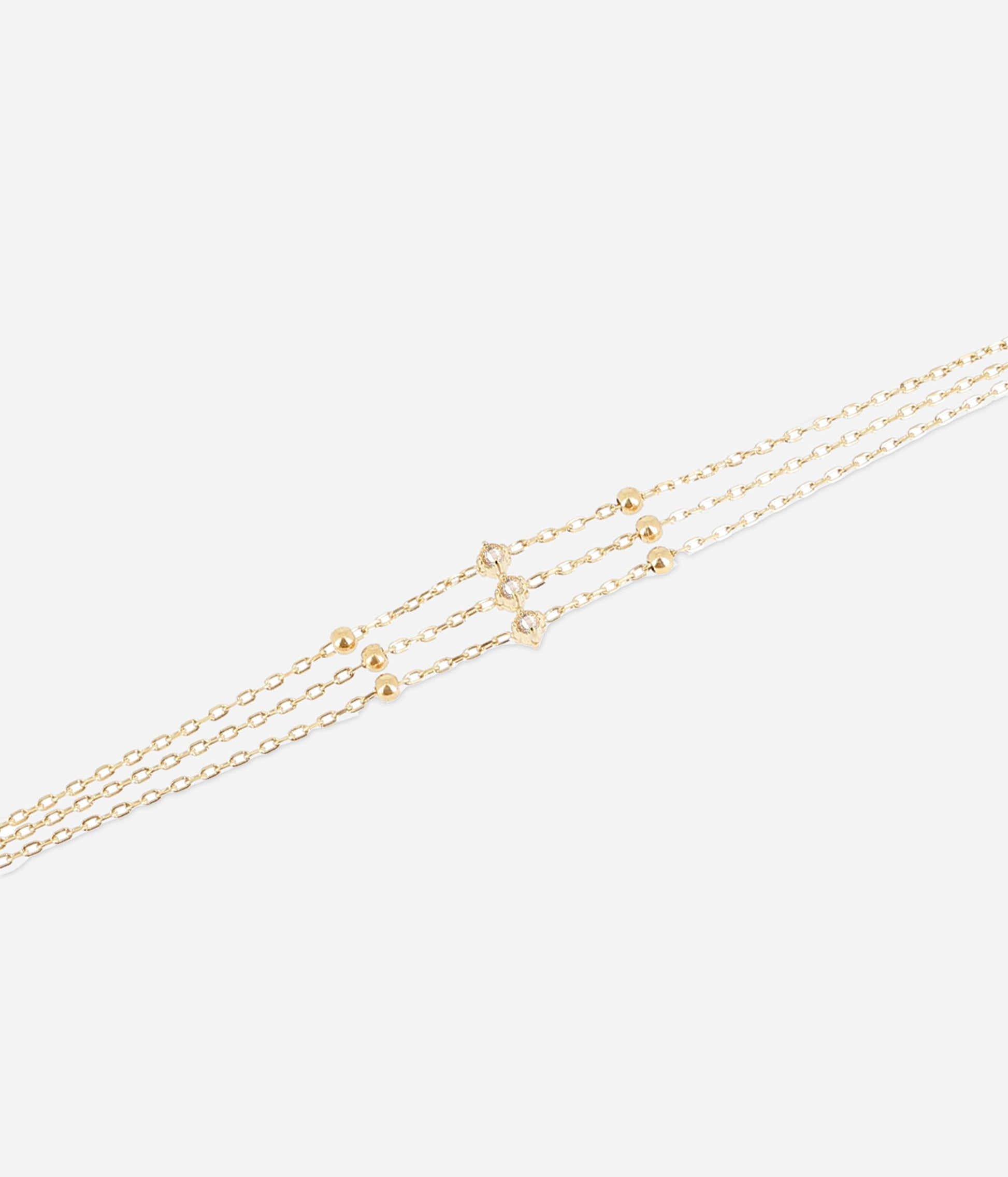 Bracelet triple chaînette en acier uni ou doré à l'or fin par ionisation sur lequel sont sertis 2 rangées de 3 boules en acier et une rangée centrale de 3 zirconiums.