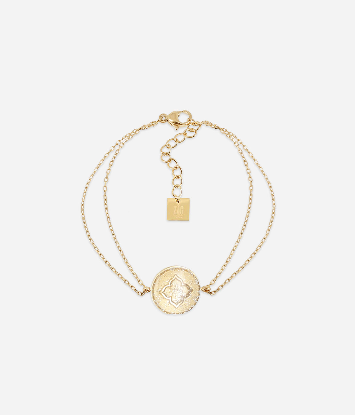 Bracelet en acier doré à l'or fin par ionisation serti d'un pendentif rond à paillettes sur lequel est gravé un lotus représentant le Chakra Racine.