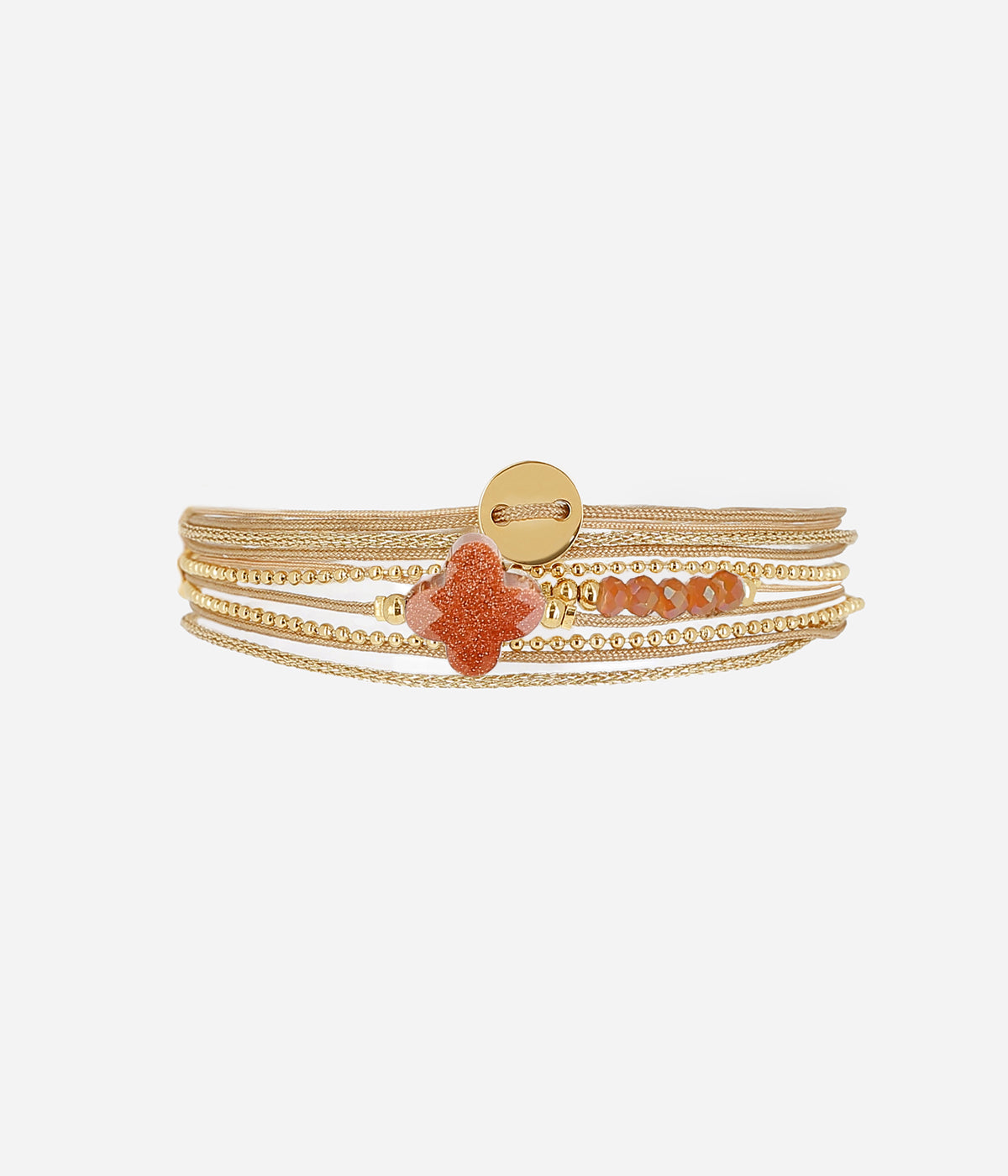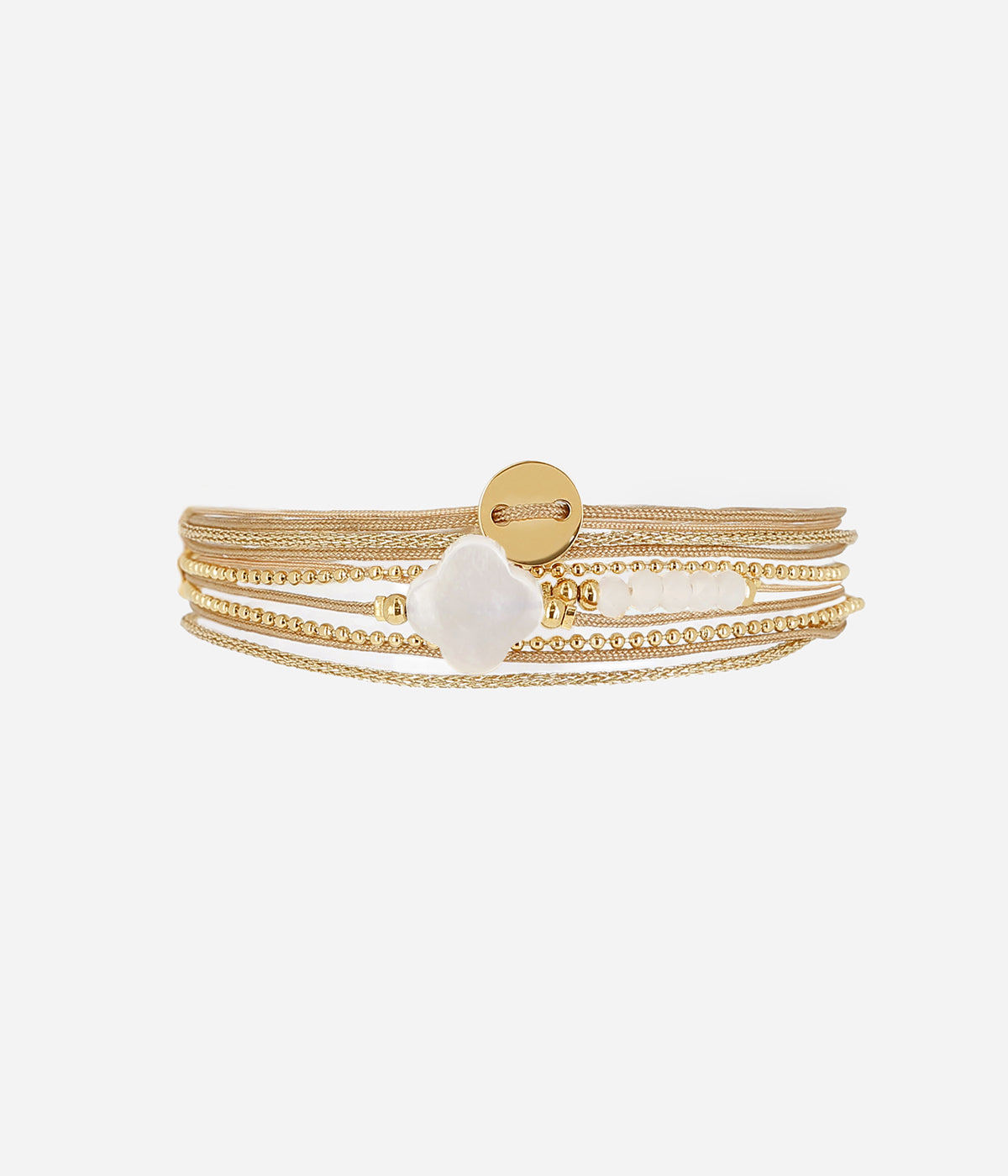 Bracelet multi-tours sur lequel sont enfilés des perles en acier doré et un trèfle.
