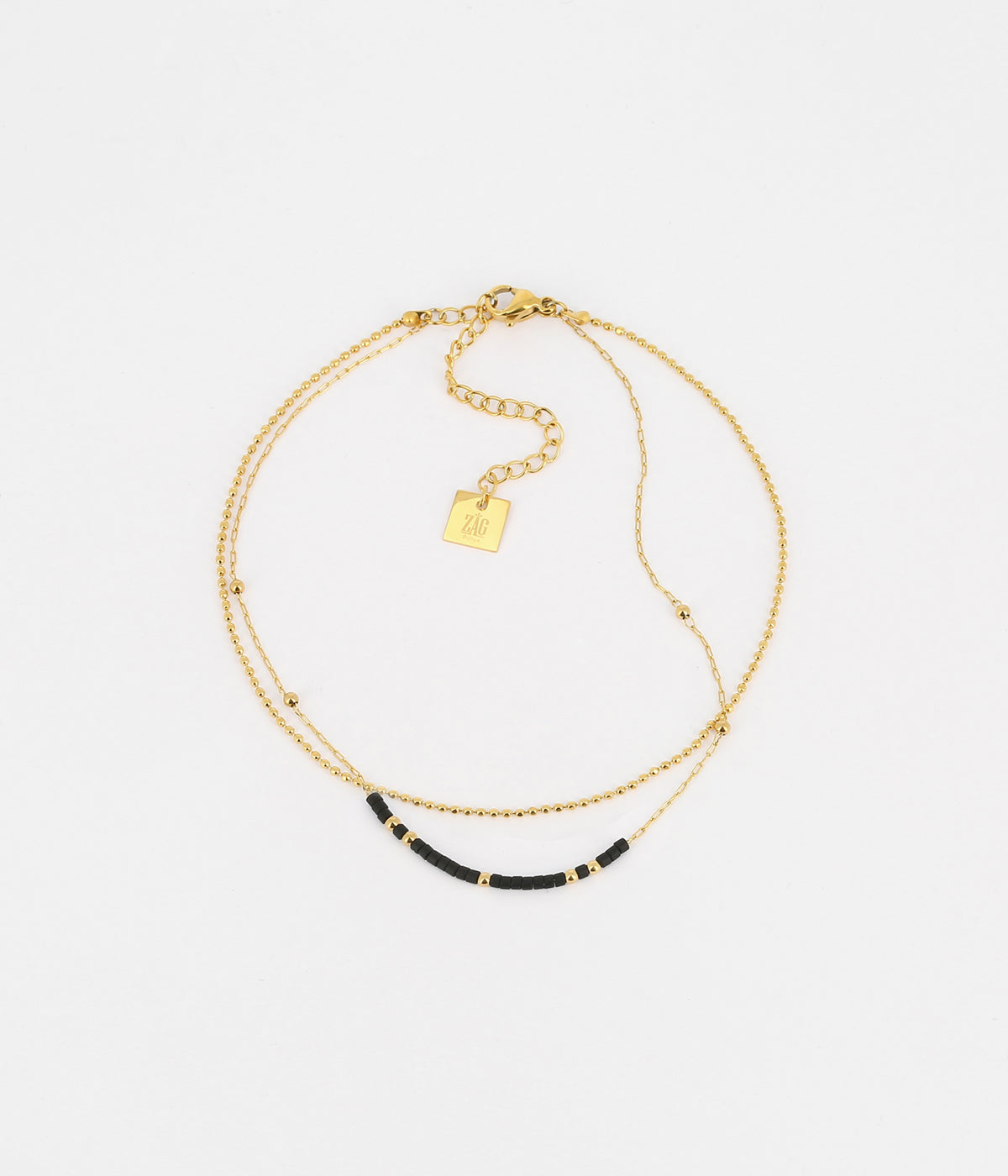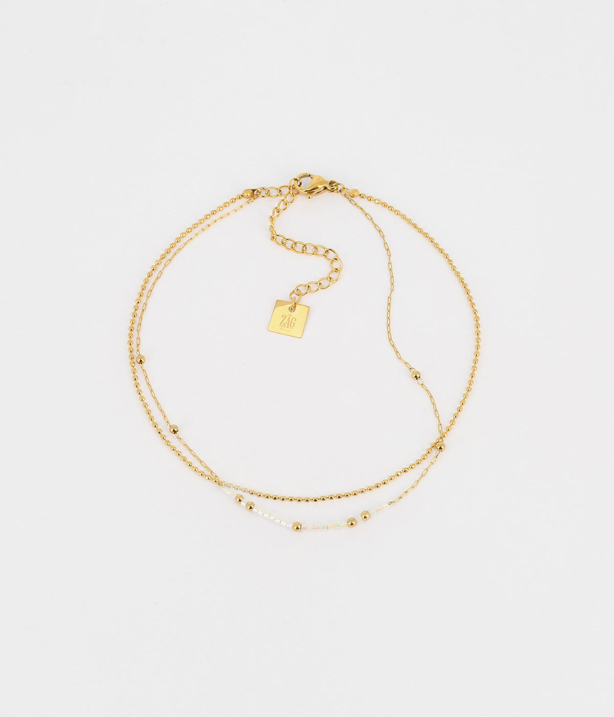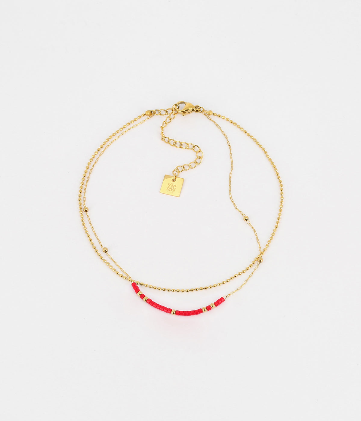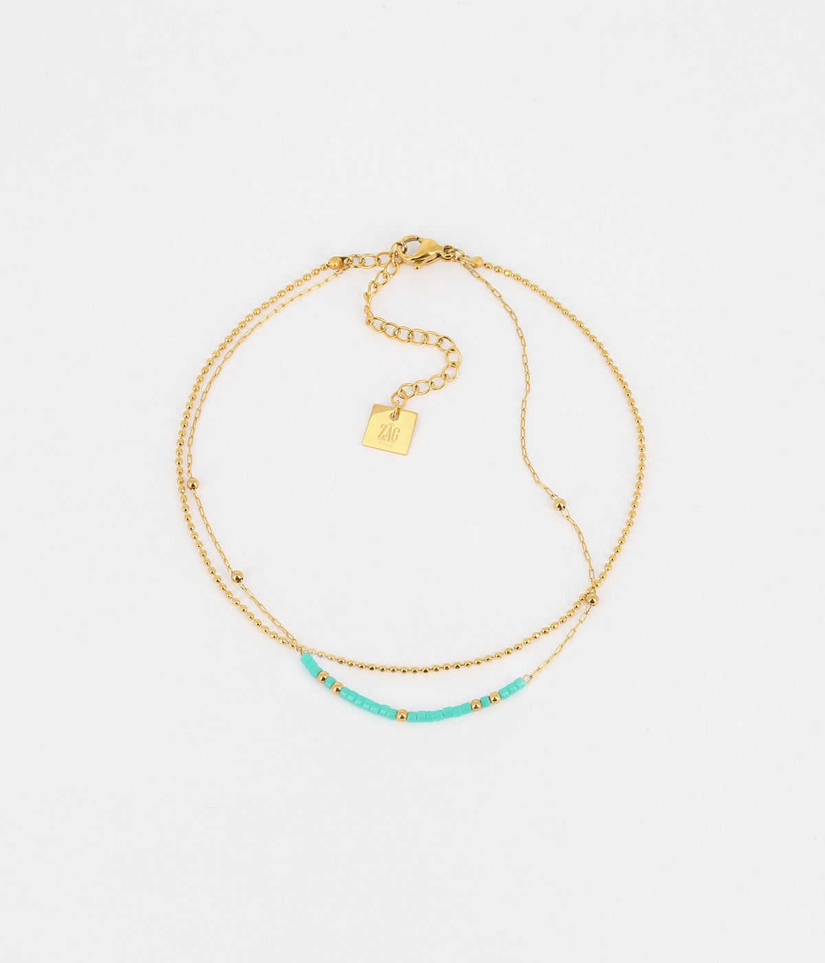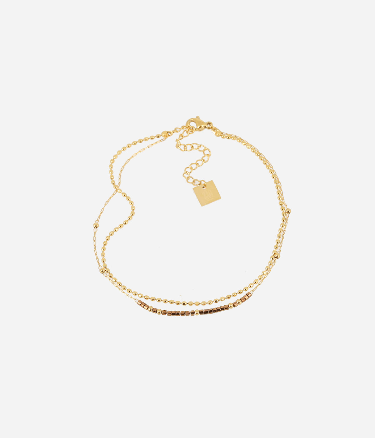 Chaîne de cheville double-rang en acier doré à l'or fin par ionisation sur lequel sont alignées des boules en acier parsemées de petites perles de Miyuki colorées.