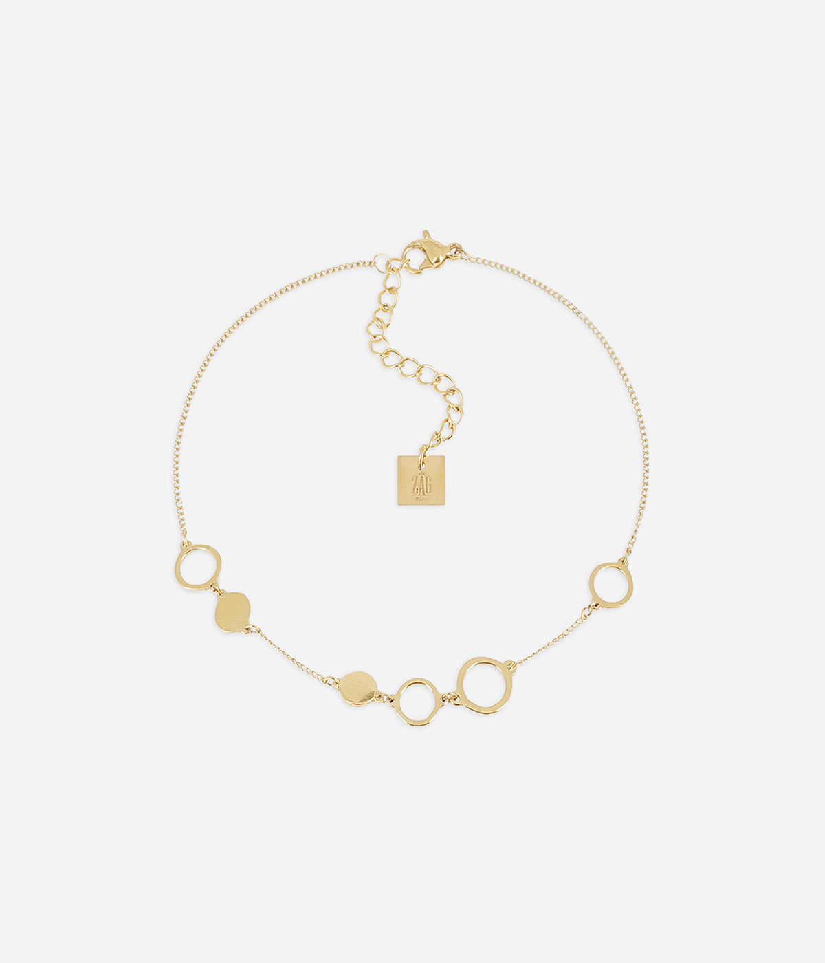 Chaîne de cheville double rangs en acier doré à l’or fin serti de plusieurs petites pastilles rondes pleines et creuses.