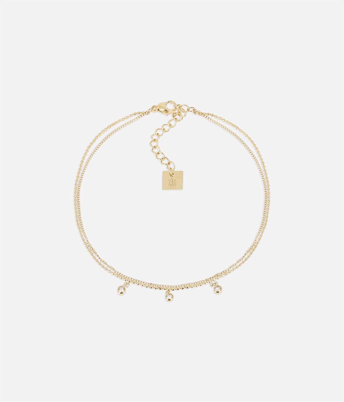 Chaîne de cheville double rangs en acier doré à l’or fin serti de plusieurs petits zirconiums.