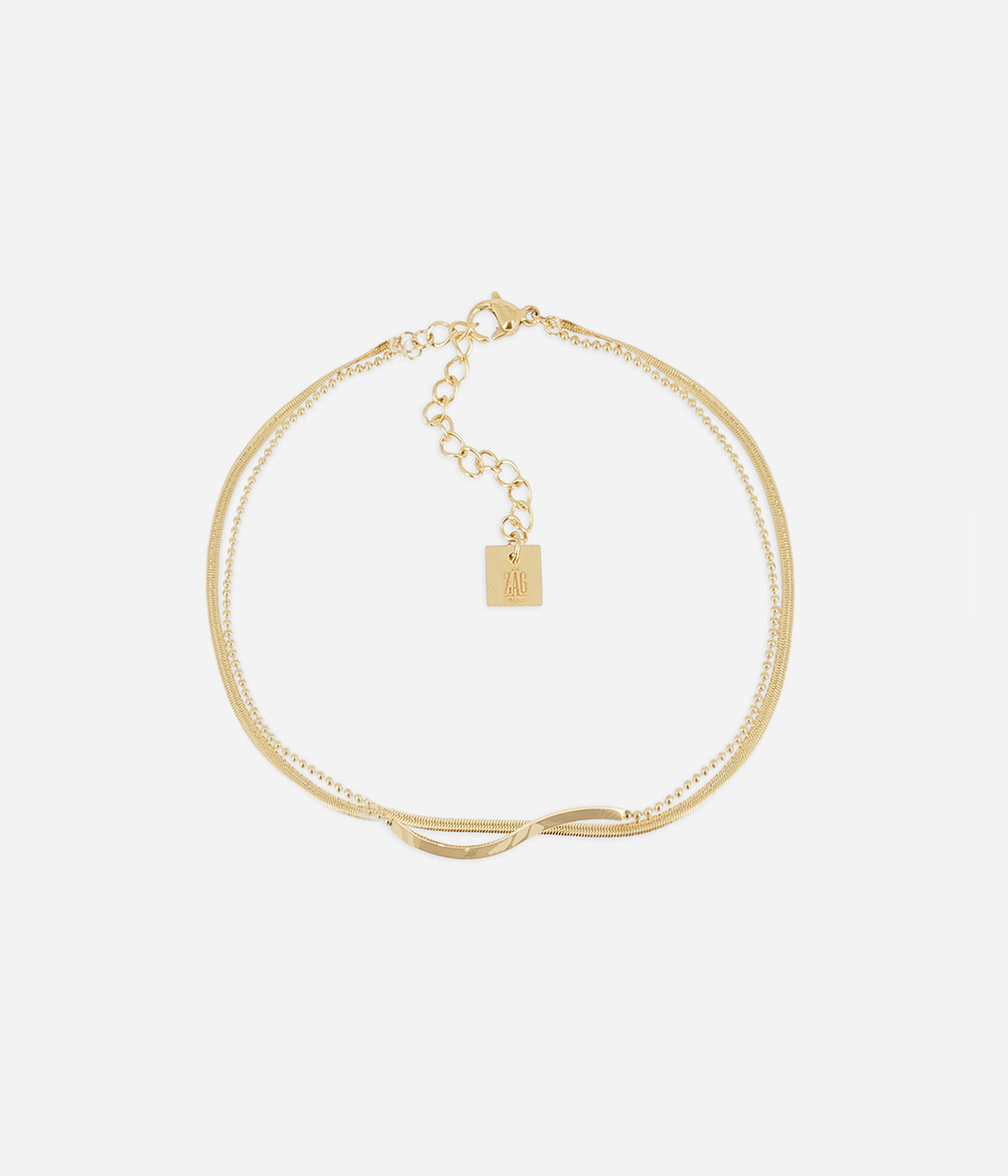 Chaîne de cheville double rangs en acier doré à l’or fin serti d'un empiècement ondulé.