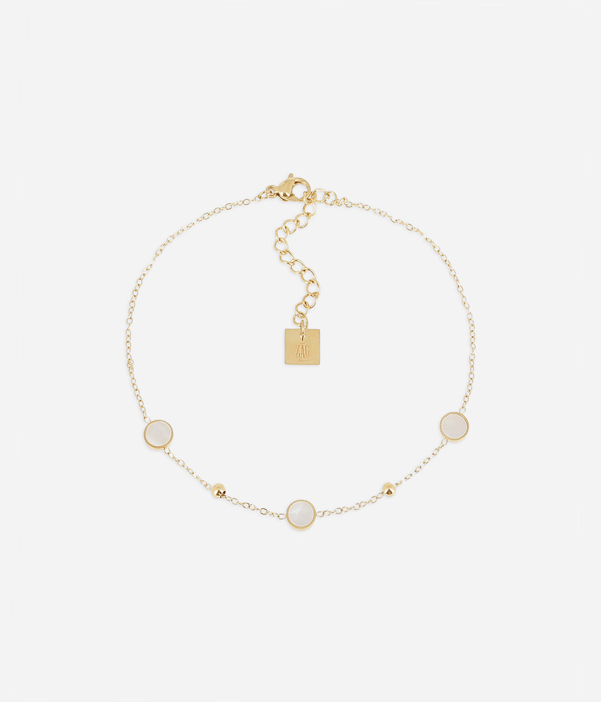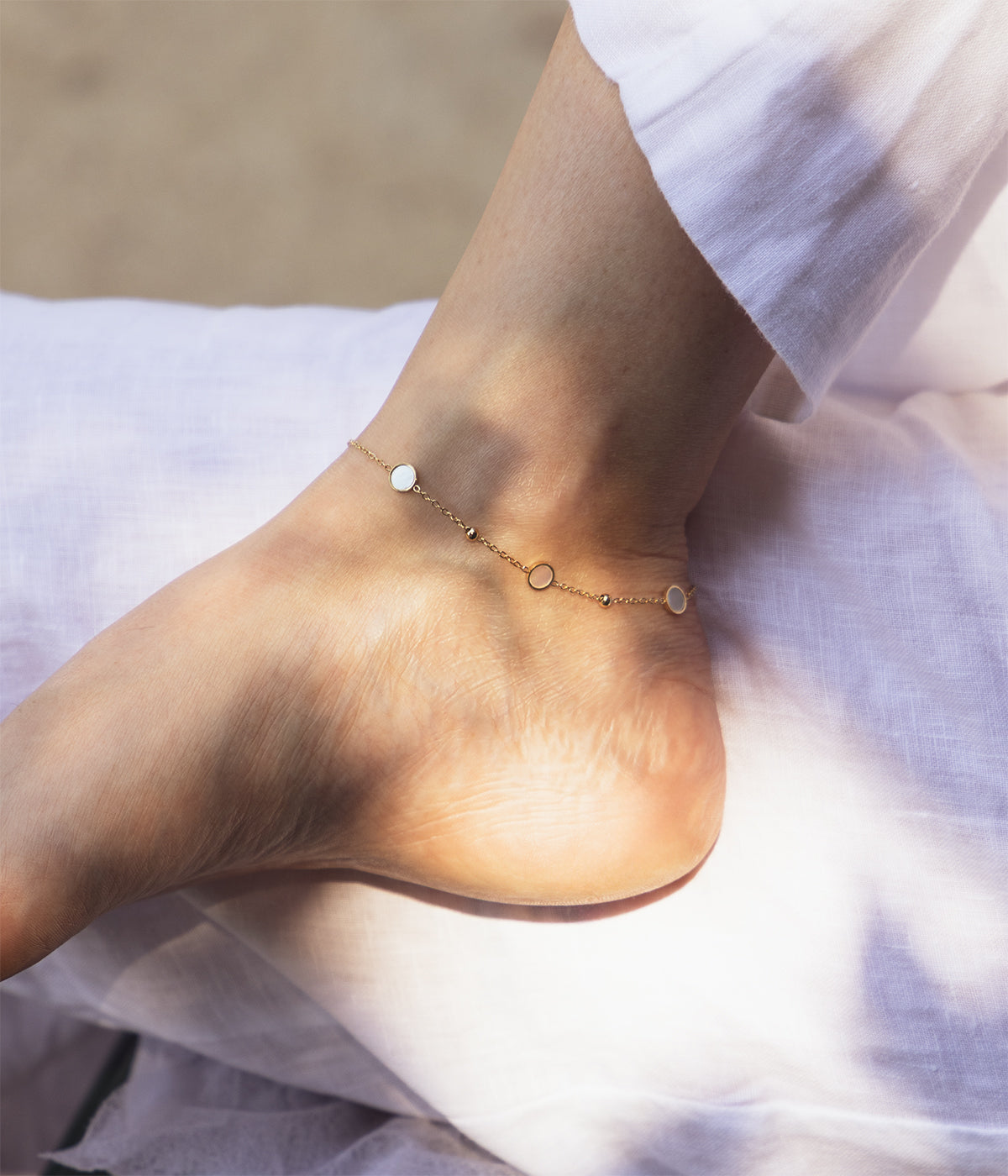 Chaîne de cheville en acier doré à l’or fin serti de plusieurs petites pastilles en nacre.