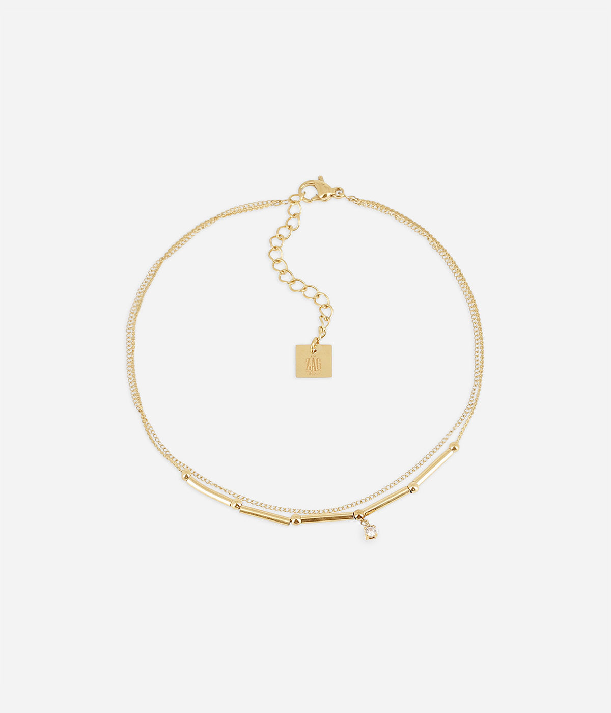 Chaîne de cheville double rangs en acier doré à l’or fin agrémenté d'un zirconium et de petits tubes en métal.