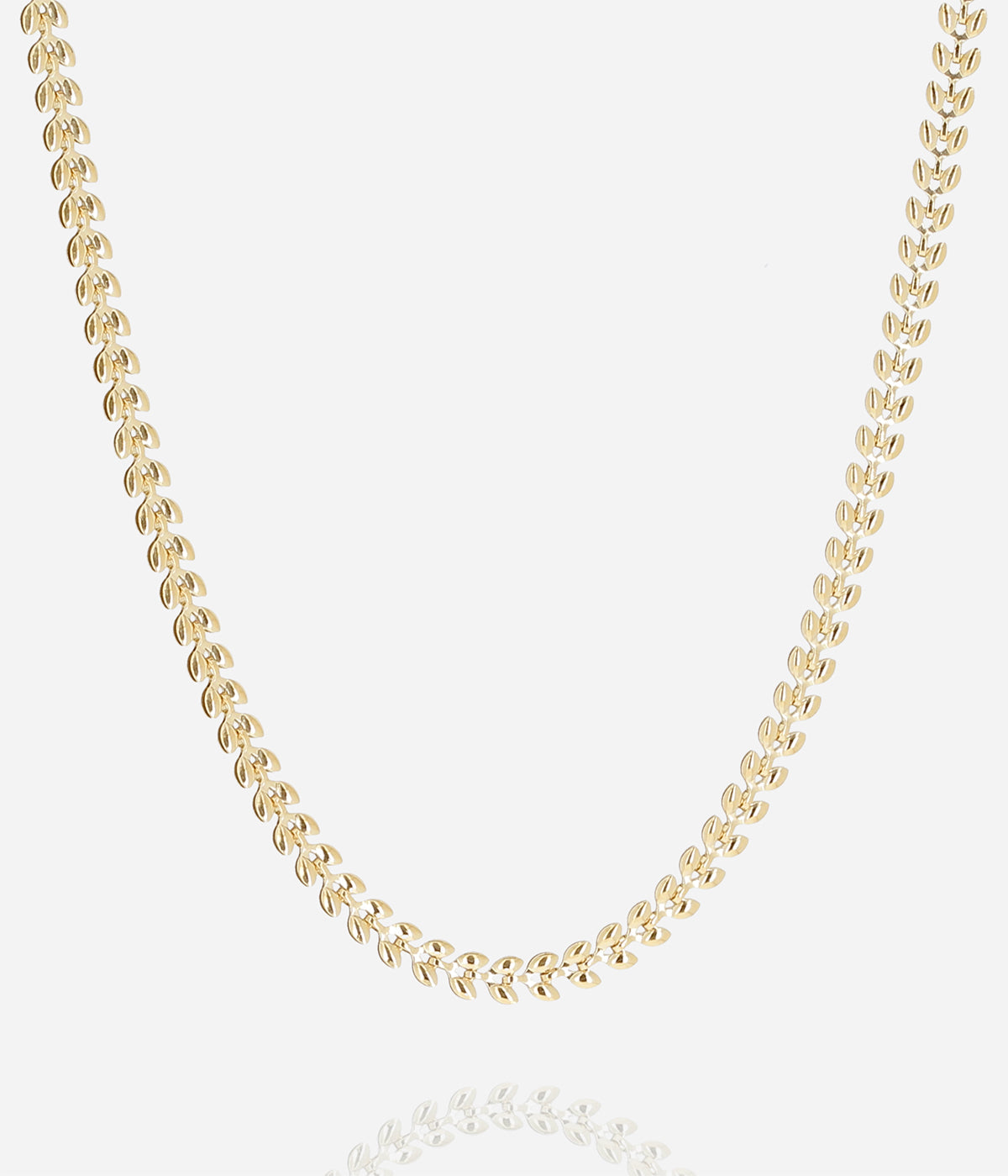 Collier en acier uni ou doré à l'or fin par ionisation avec des maillons en forme de feuilles.
