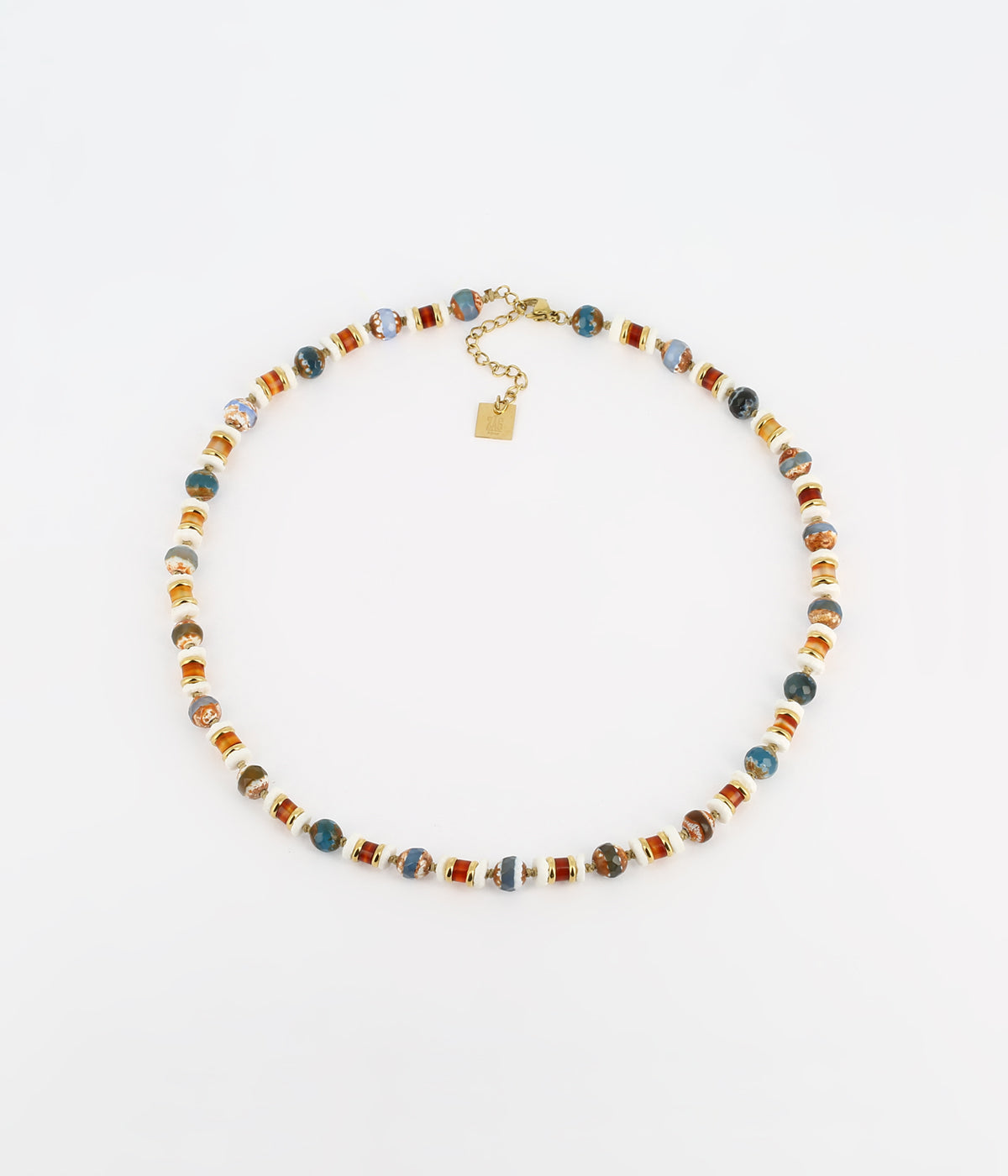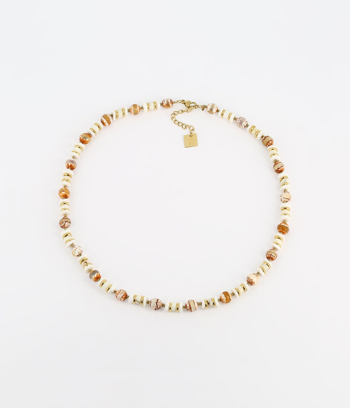 Collier en coton naturel sur lequel sont enfilées des pierres naturelles de plusieurs formes et parsemées de plaque en acier.