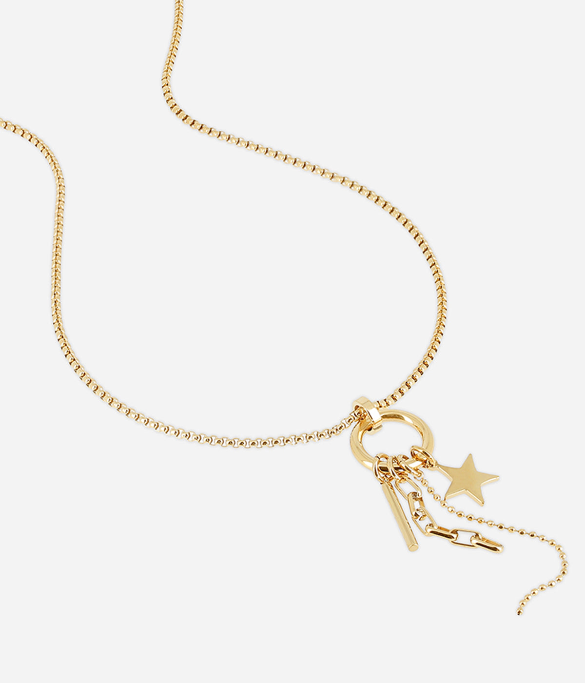 Collier sautoir en acier uni ou doré à l'or fin par ionisation au bout du quel est suspendu un pendentif rond serti de charms : étoile, tige, chainette..