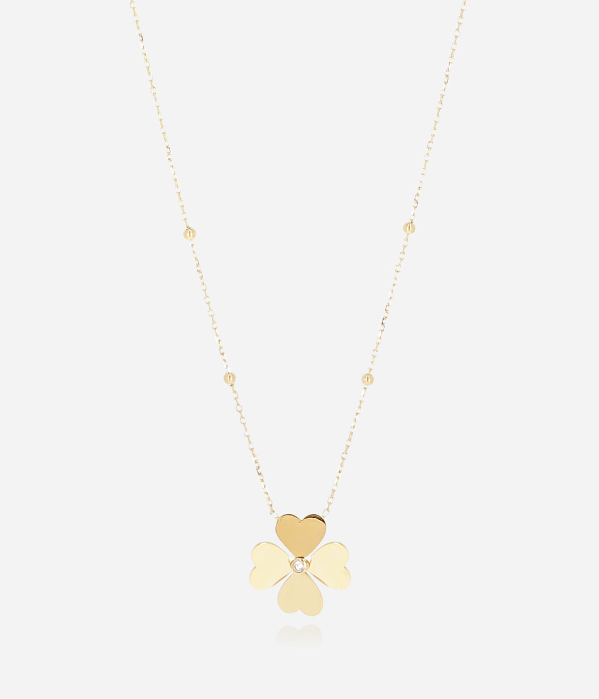 Sautoir en acier uni ou doré à l’or fin serti d'un trèfle à quatre feuilles en acier au milieu duquel se trouve un zirconium.