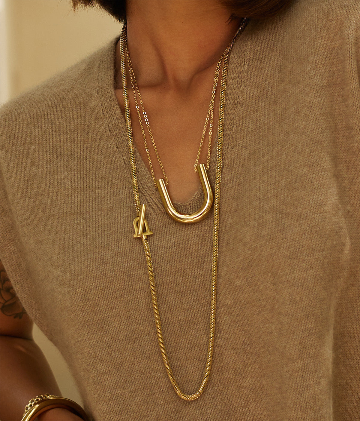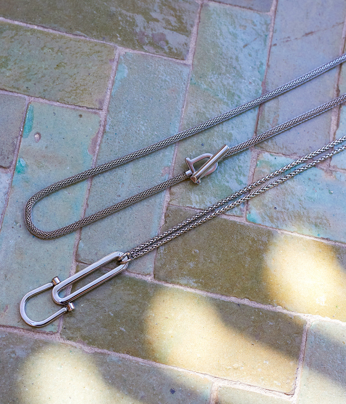 Collier en acier doré à l'or fin par ionisation. Sa maille en forme de chaine serpent arrondie se termine par un fermoir avec un anneau et une tige qui se glisse à l'intérieur.